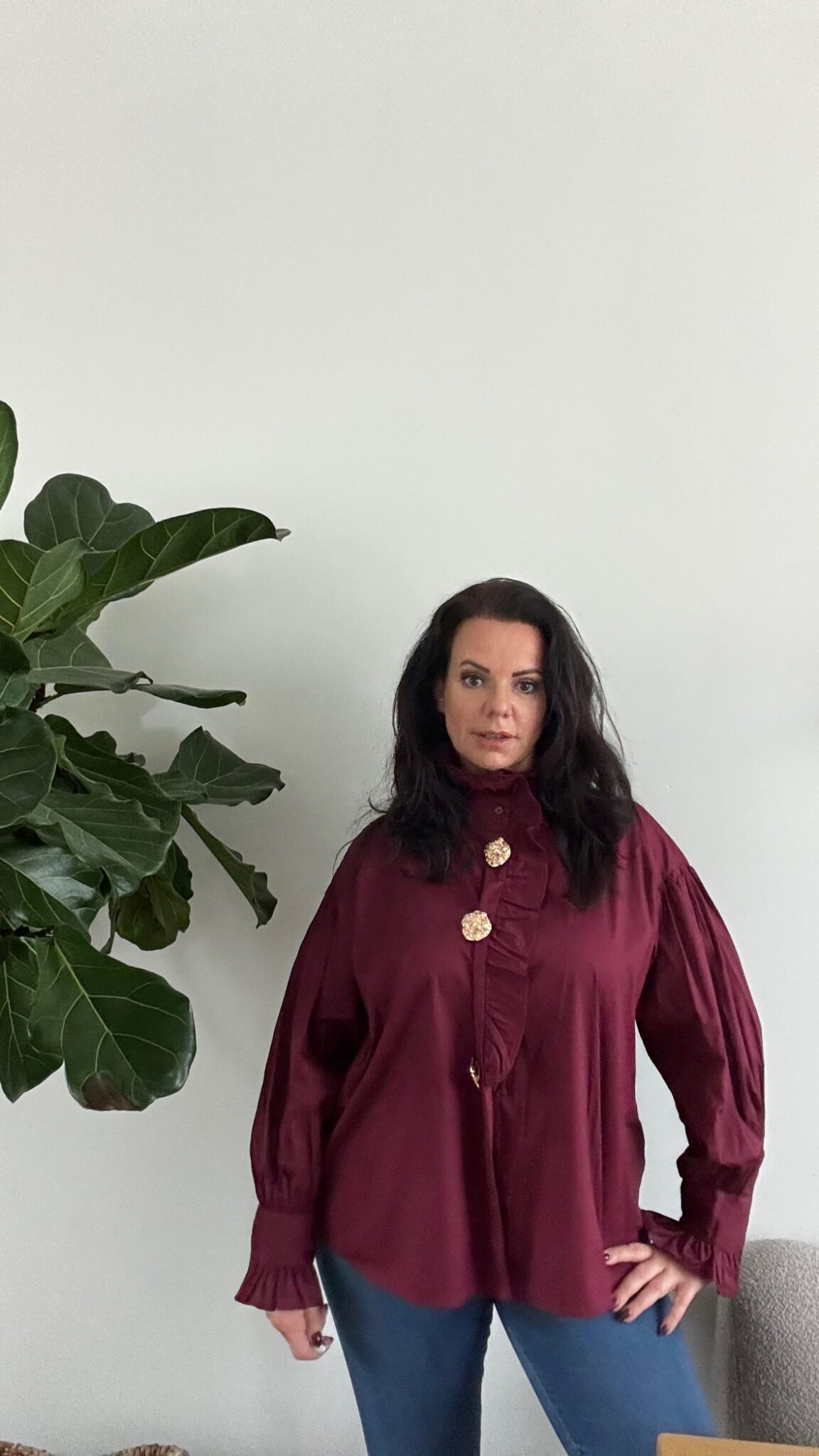 Als extra detail heeft de blouse drie gouden broche-knopen die je eenvoudig kunt verwijderen of verplaatsen — zo creëer je steeds een andere look.